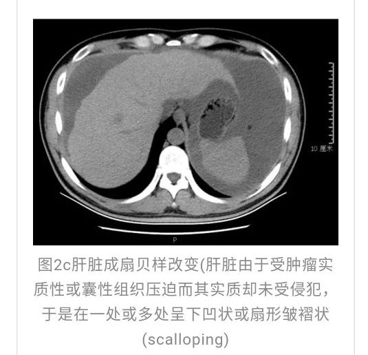 本例确诊后对B超及CT再次回顾发现:腹腔、盆腔可见不均质中强回声包块,部分呈囊实状,腹膜增厚,大网膜成饼状(如图2A)和肝周可见不均质中强回声弧形压迹、脾周可见不均质中强回声包饶,肝脏成扇贝样改变(如图2C),但在诊断报告中未提及。有学者发现mantle和scalloping(如图2A,2C)在PMP中具有代表性,且mantle较scalloping更为常见,若mantel征同时伴有大小不一的囊性改变,则更具诊断价值。