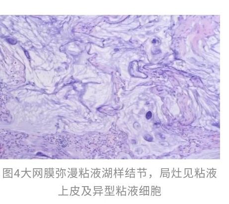 腹腔镜下观察:肝脏、脾脏、全部结肠和系膜、腹主动脉旁、乙状结肠系膜根部、盆腔侧壁无肿大淋巴结。可见大网膜形态异常,挛缩呈饼状,表面大量清亮滤泡,小肠轻度充血,肠间隙见大量纤维性渗出。经脐下纵行切口抬起大网膜,弯钳阻断大网膜组织内血管,切取约3cm×3cm大小网膜组织送检。病理诊断结果:(大网膜结节)大网膜弥漫黏液湖样结节,局灶见黏液上皮及异性黏液细胞,形态倾向浸润性或转移性黏液性肿瘤,免疫组化:villin(-)AE1/3(+)。