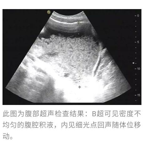 腹部B超:(1)轻度脂肪肝,肝囊肿;(2)胆囊壁异常高回声,考虑可能为息肉;(3)腹腔大量积液(肝前、腹腔分别见深度3.3,10.2cm异常无回声,内见细光点回声,随体位移动)。患者经试验性抗结核治疗无明显疗效且肿瘤指标明显异常,故排除结核性腹膜炎。